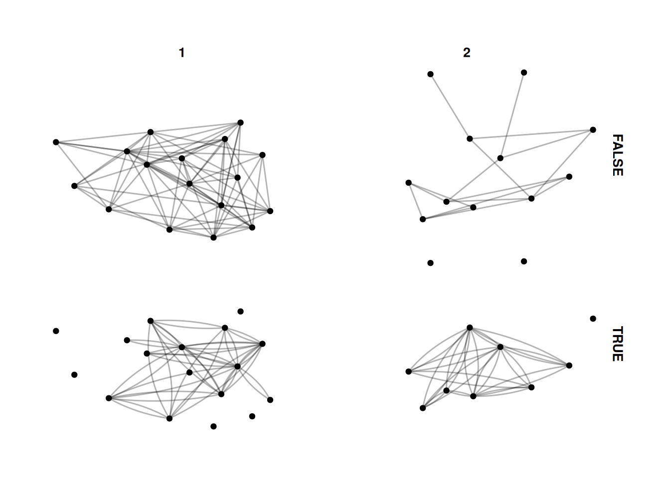 There are a few different options - facet_nodes as used above, splits a network based on node attributes. facet_edges keeps the nodes in the same position, and filters the edges based on some attribute of the edges. For example, this shows reciprocated and non-reciprocated edges.