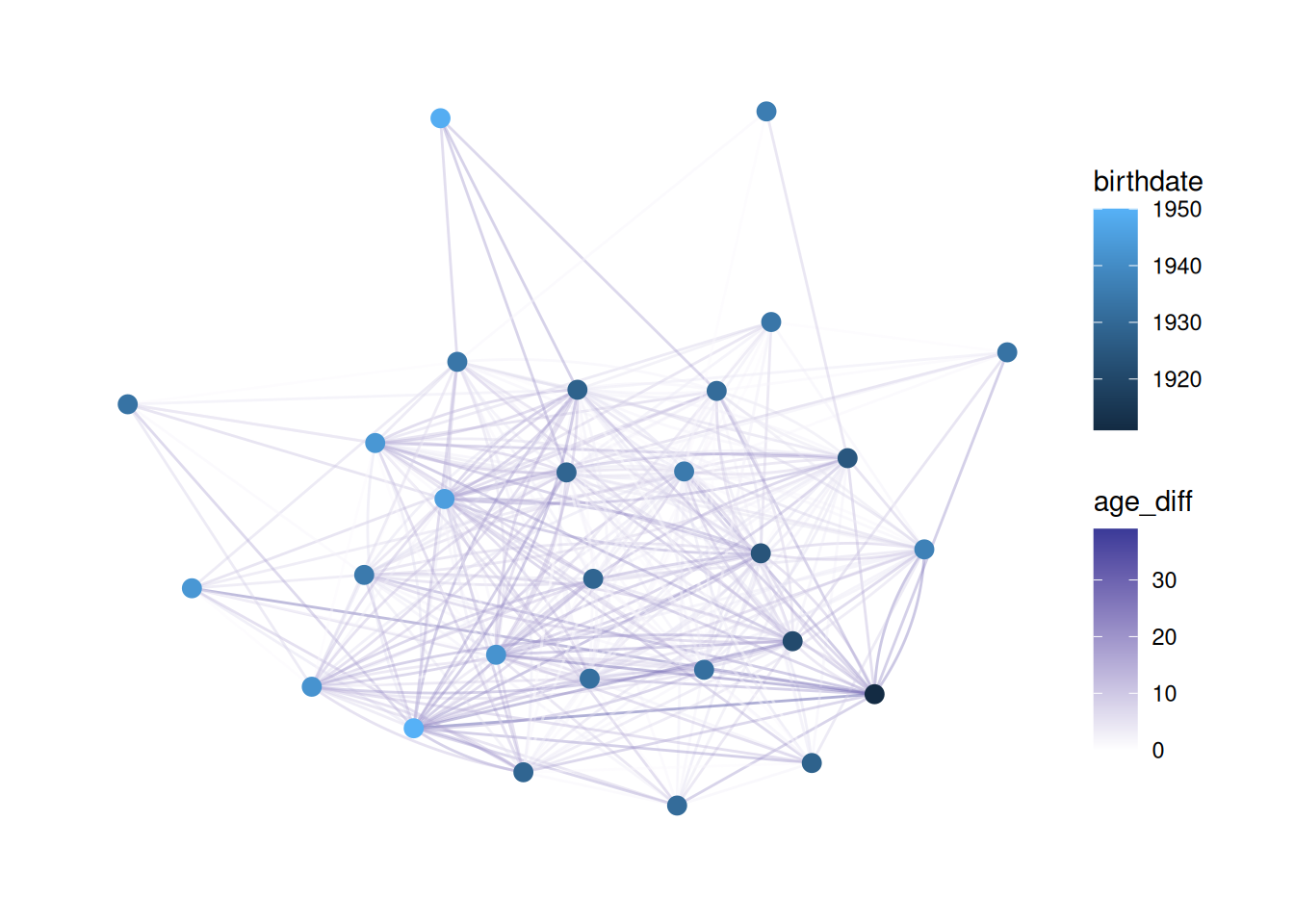 Putting it all together, abs(.N()$birthdate[from] - .N()$birthdate[to]) subtracts the birthdate of the “to” node from that of the “from” node, and takes the absolute value. It saves that as age_diff and then colors edges based on that.