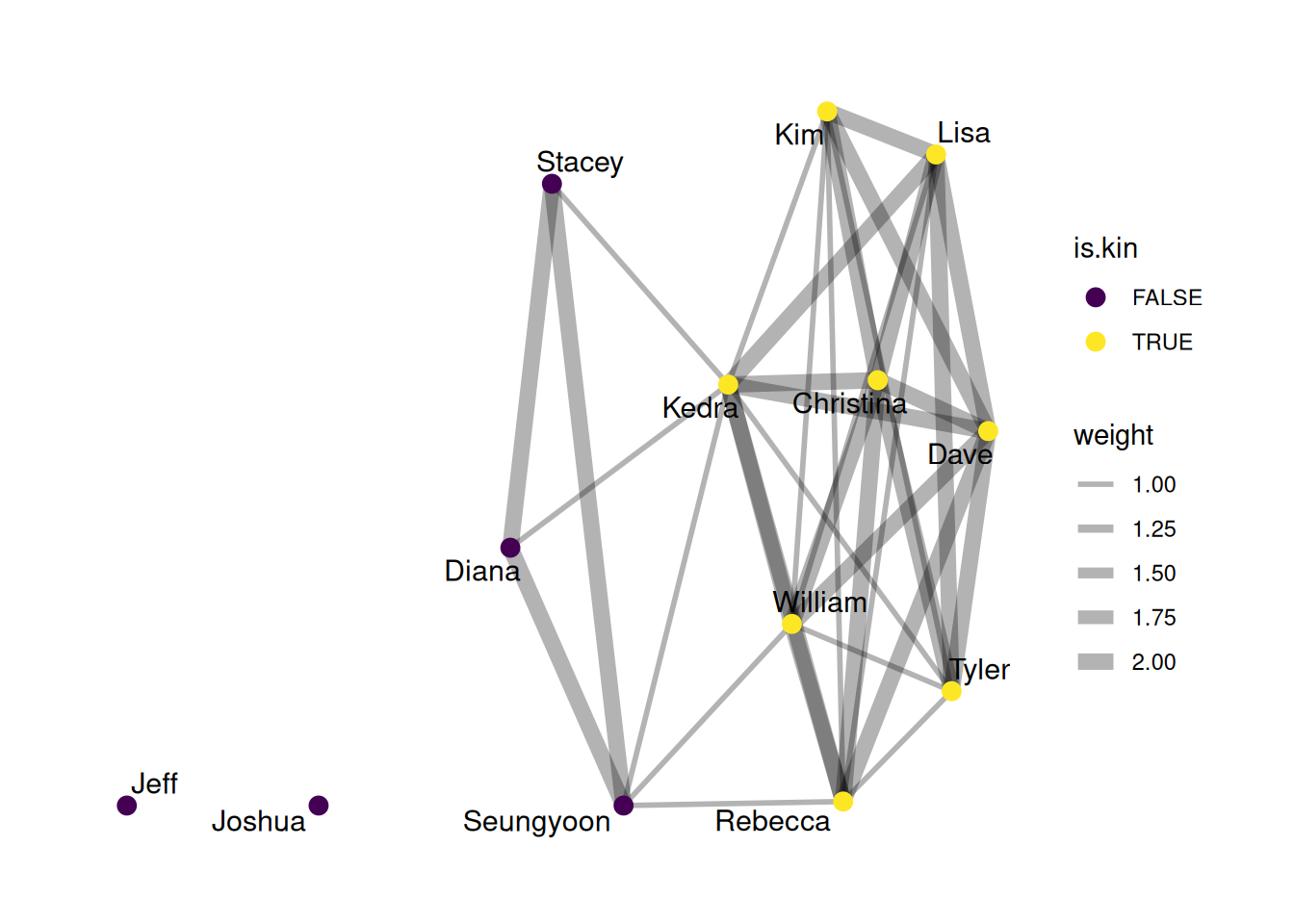 For is.kin, write TRUE if they are related to you and FALSE if they are not. Then, make a spreadsheet that’s an edgelist with a row for each connection in your network. For each edge, put the edge weight as 0 if they are strangers, 2 if they are especially close, or 1 if they are somewhere in between.