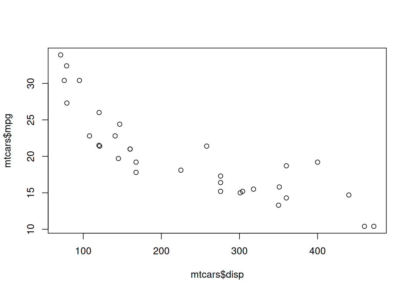 For example, the code below creates a scatterplot. For now, don’t worry about what all of the code means—we’ll come to that in later lessons. Just note that when you render the document, it doesn’t show the plot(mtcars$disp, mtcars$mpg) code—it just shows the scatterplot.