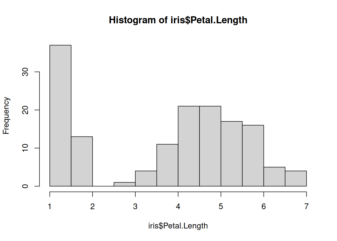 hist(iris$Petal.Length)If you do it correctly, you should see a histogram plot (a figure with a bunch of vertical gray bars)