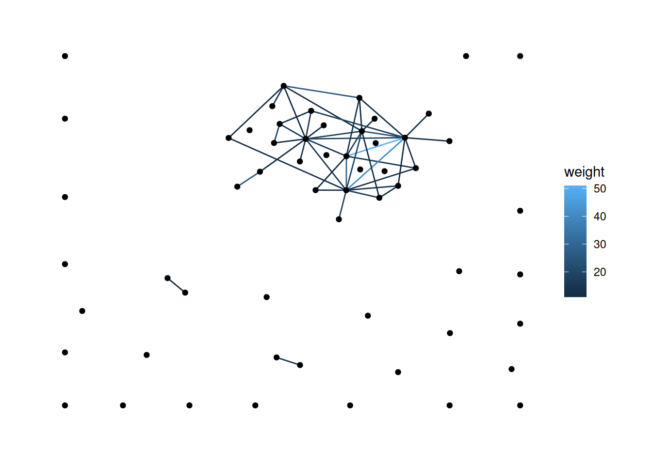 Looking at our data, the edges don’t have weights, so let’s load in a dataset that does. The code below loads the fourth network from the animal_13 data—edges represent how long ants spent near each other—and colors the edges based on their weight.