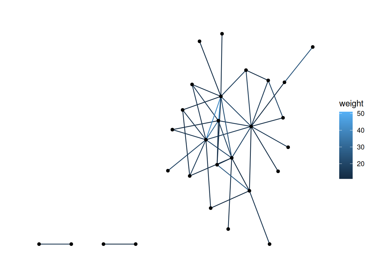 bkfrab data, there are a lot of nodes with edge weight 10. Filter to just the edges whose weight is greater than 10, and map the color of the edges to their weight.Using "stress" as default layout