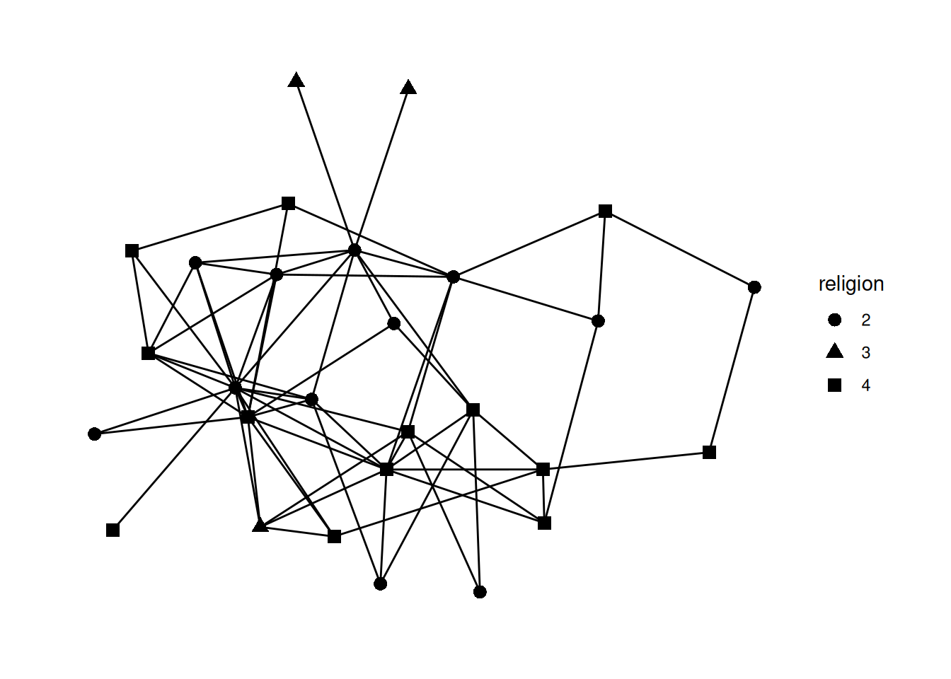 To do that, we “map” the shape of the nodes to the religion variable. The syntax to do this is aesthetic=column name. So, to change the shape based on the data in the religion column, it’s shape = religion. We put that whole thing in aes (which stands for mapping aesthetic), and put it into the geom_node_point function.