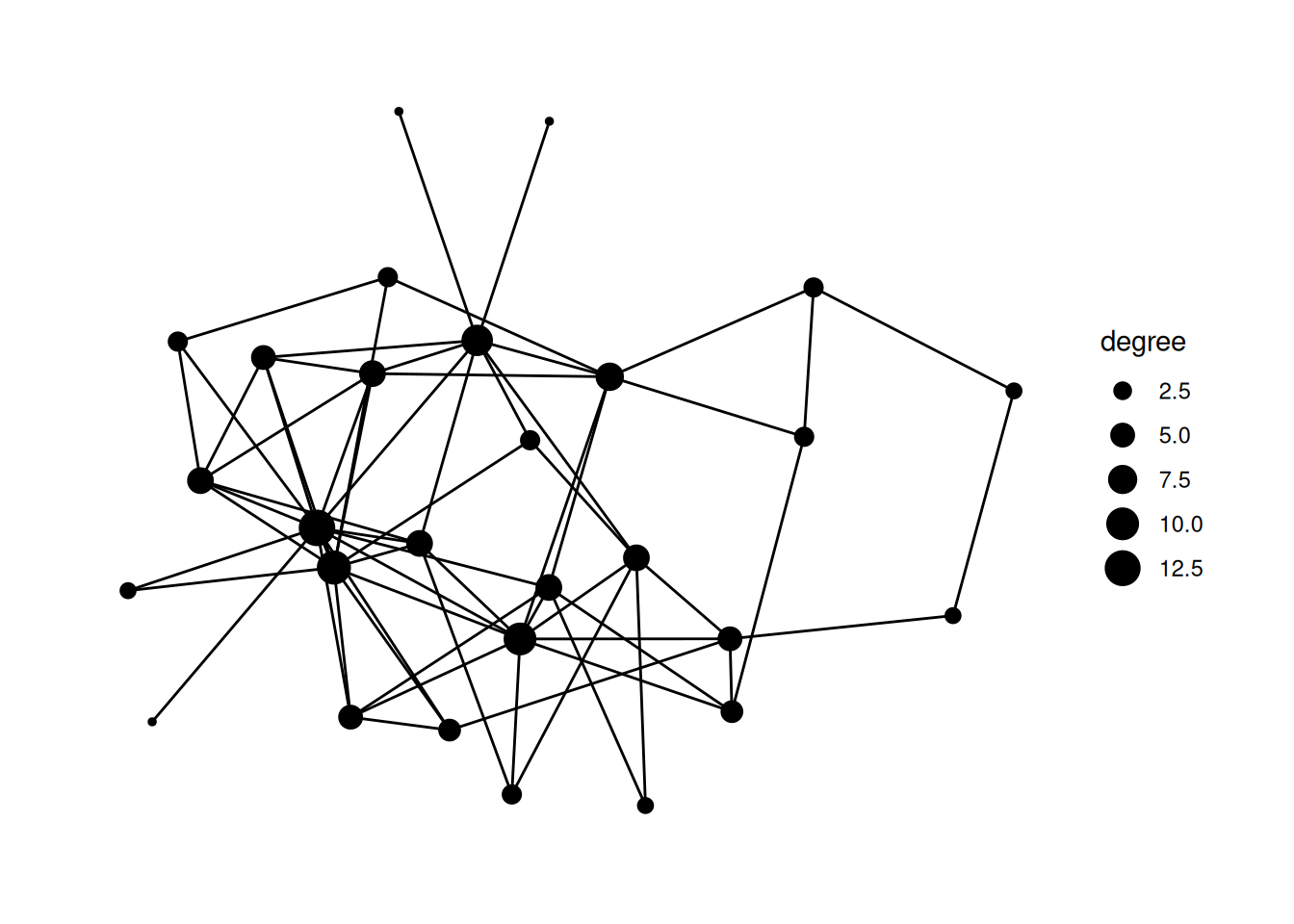mutate and figure out how to calculate the degree centrality for our network; save the centrality in a column called degree and change the size of nodes based on the degree.Using "stress" as default layout