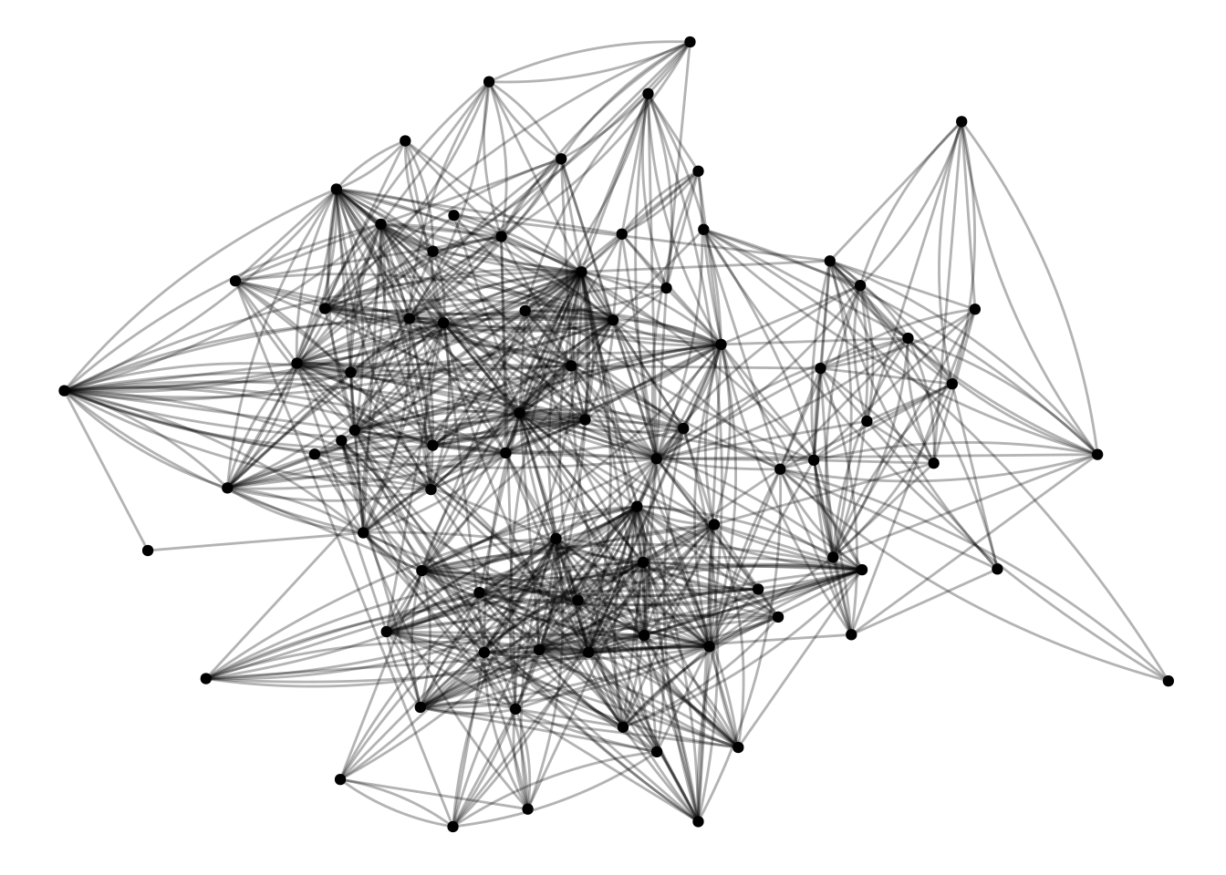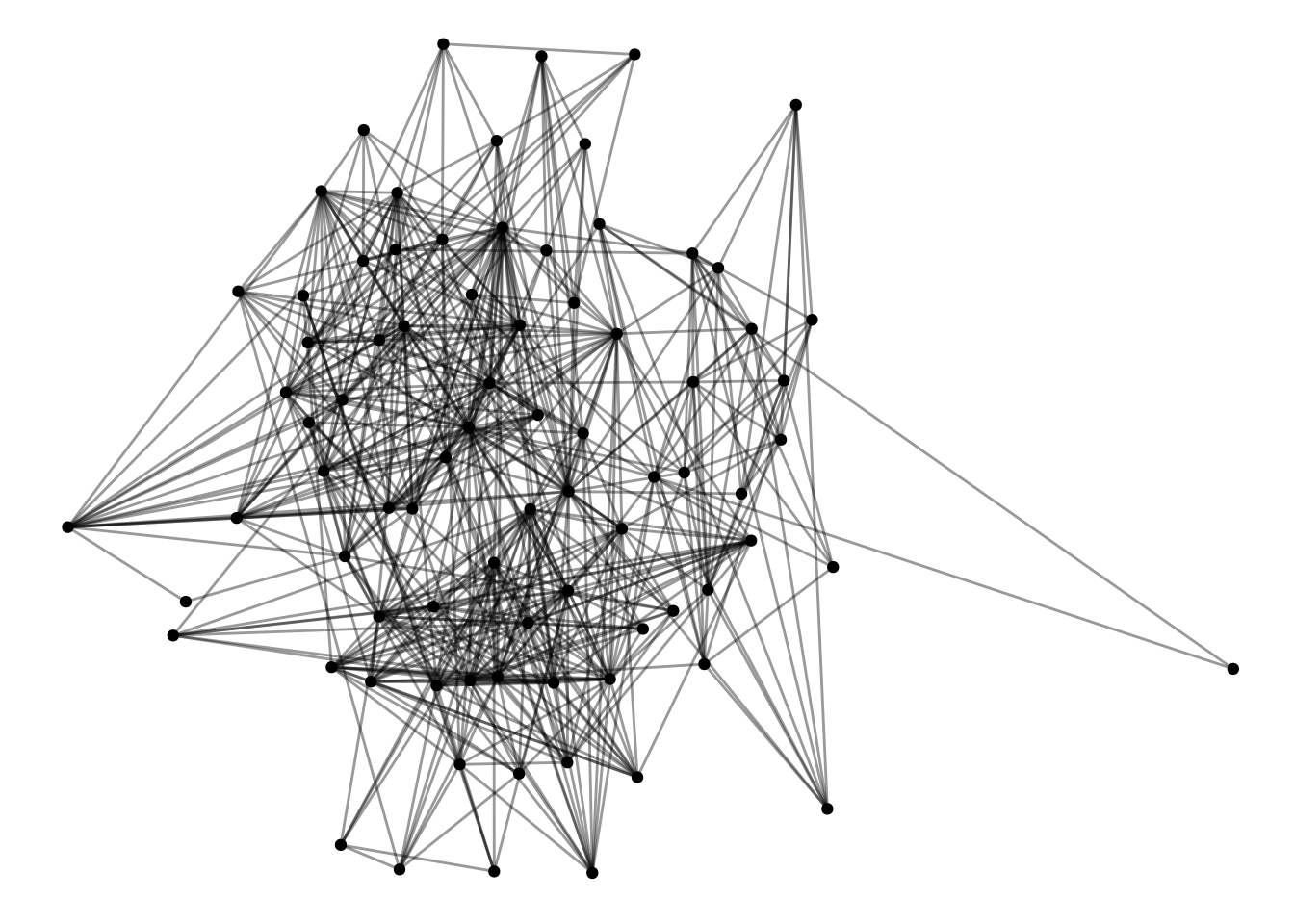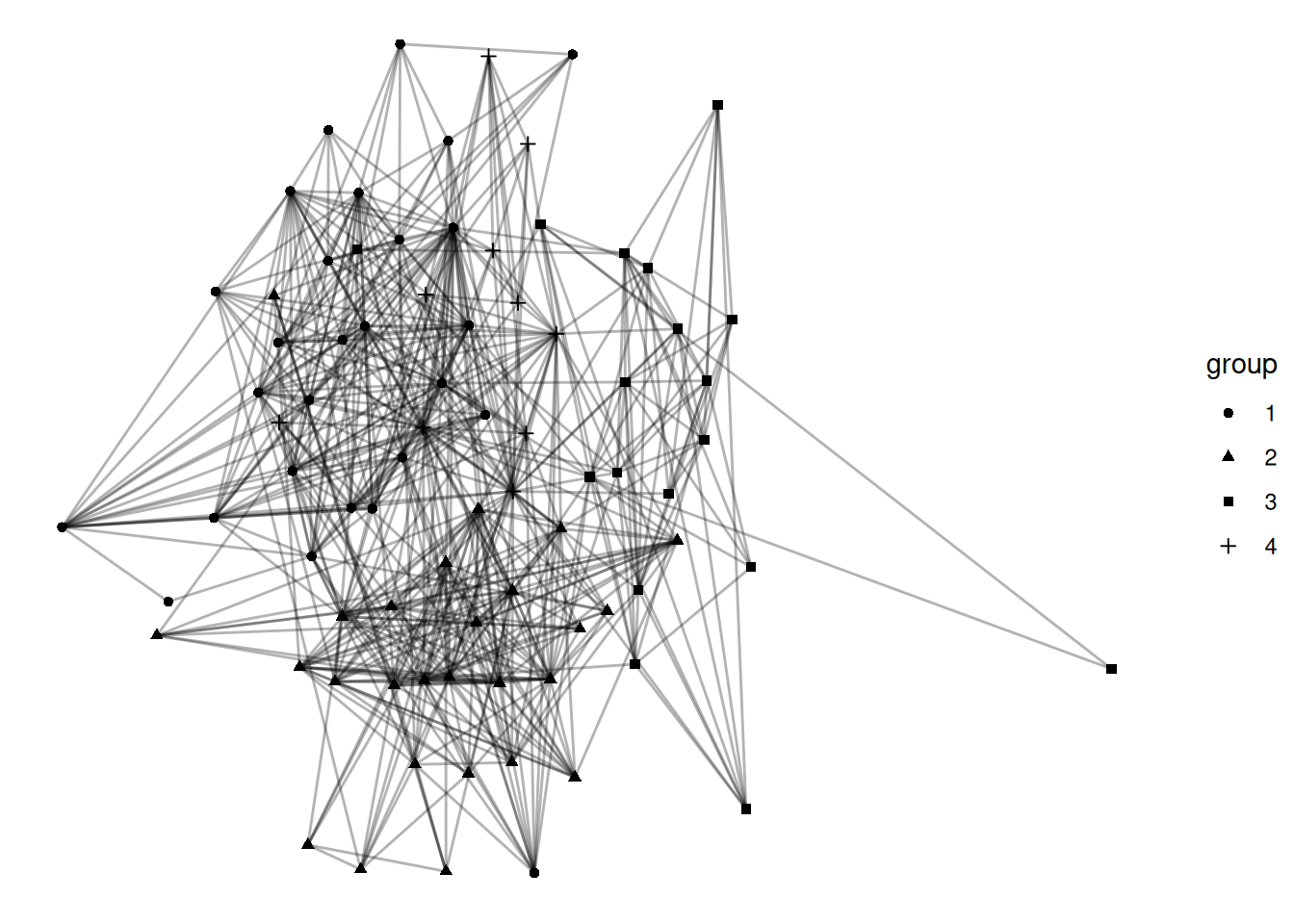 #install.packages('igraphdata') # Run this if it isn't installed yetlibrary(igraphdata)data("UKfaculty")UK <-as_tbl_graph(UKfaculty)UK |>activate(edges) |>ggraph() +geom_edge_fan(alpha=.3) +geom_node_point()