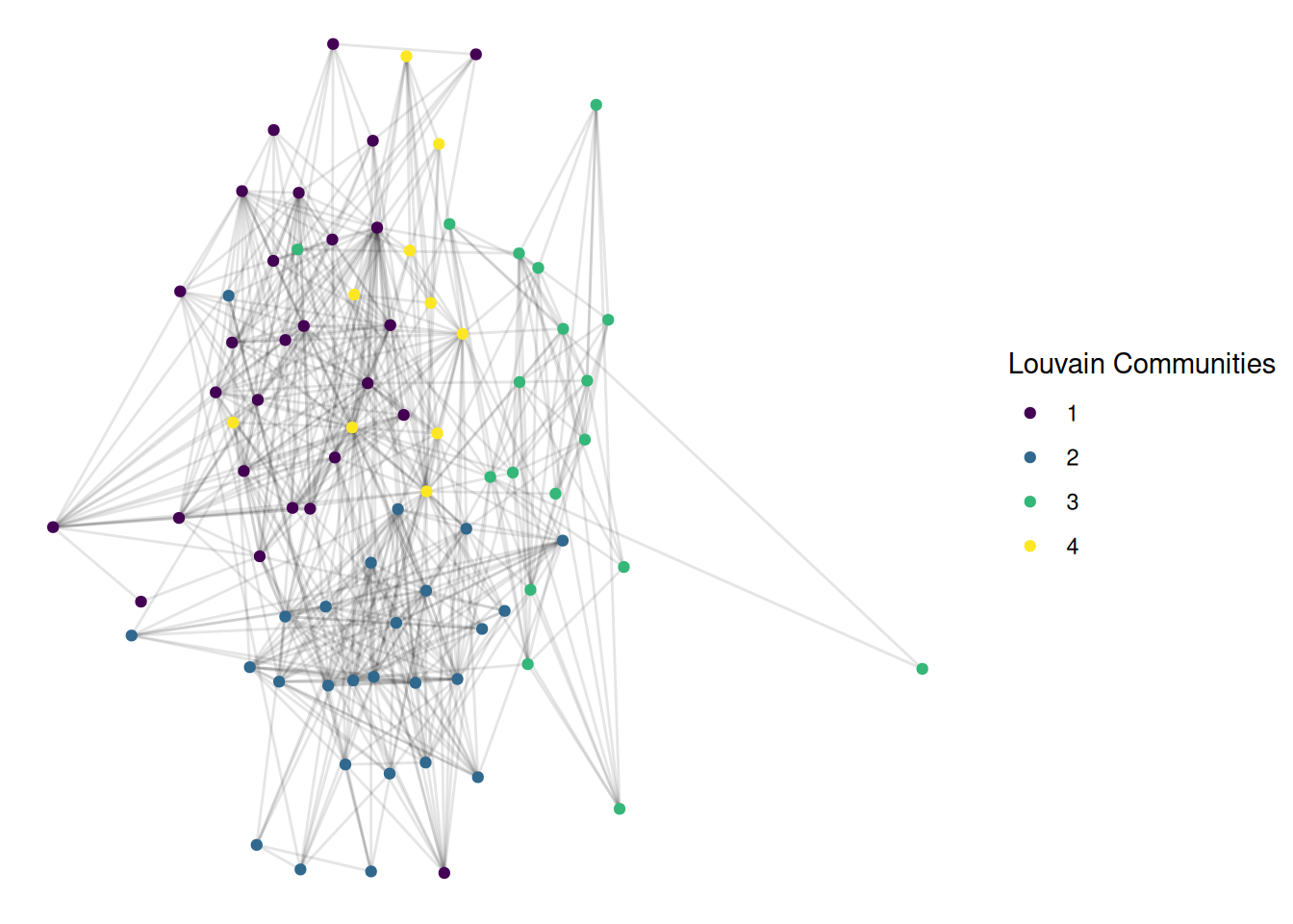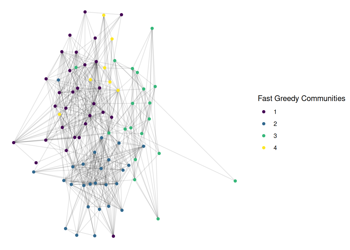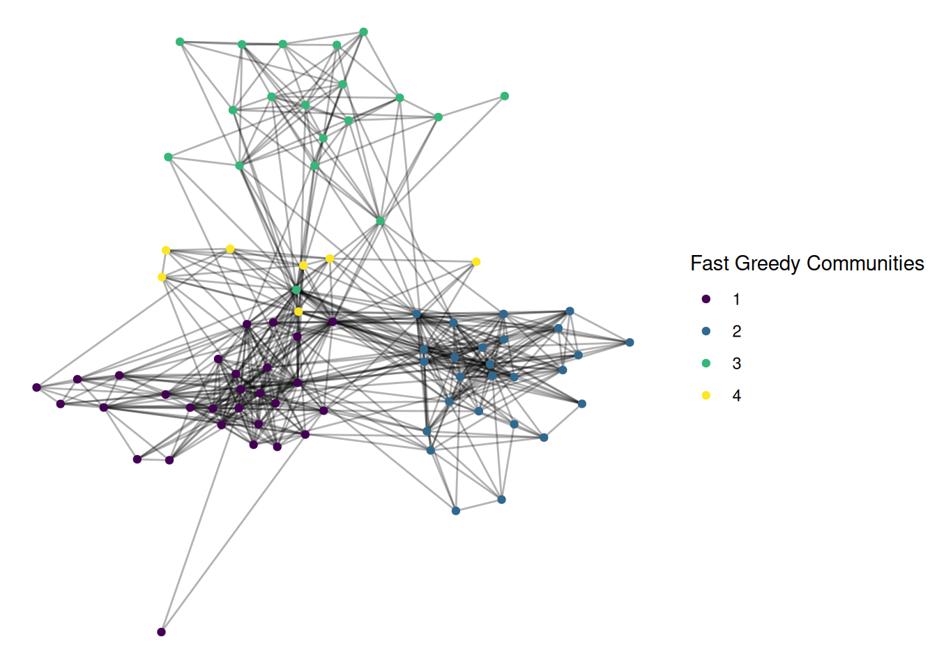 There are a number of more complicated algorithms for finding communities in networks, often called “community detection” or “clustering” algorithms. The very bottom of this page shows those which have been implemented in ggraph.