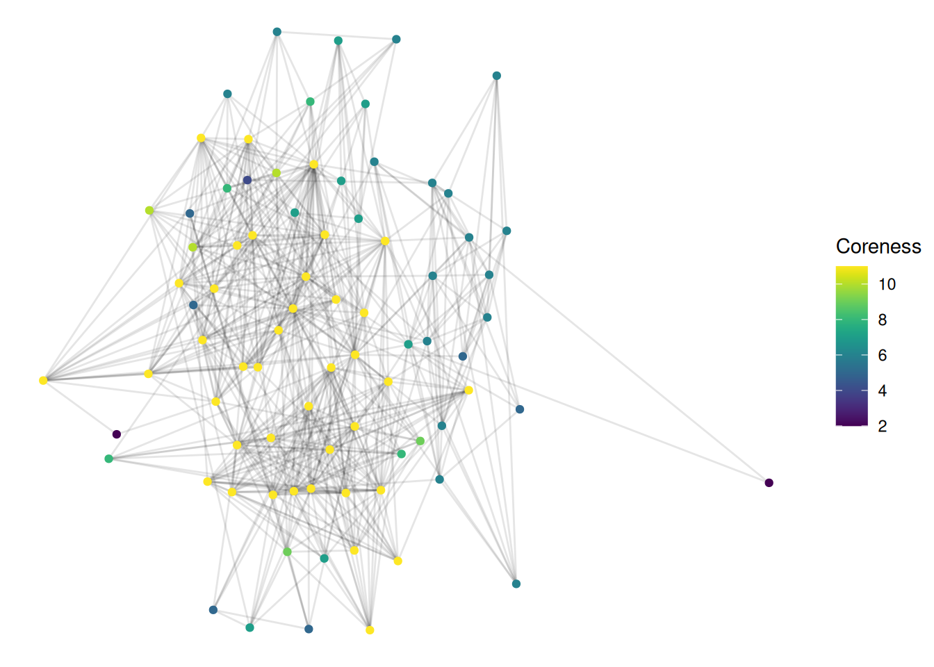 Basically, nodes with a high coreness number are connected to lots of others who are themselves well-connected. This is a great measure for identifying groups that hold important, central positions.