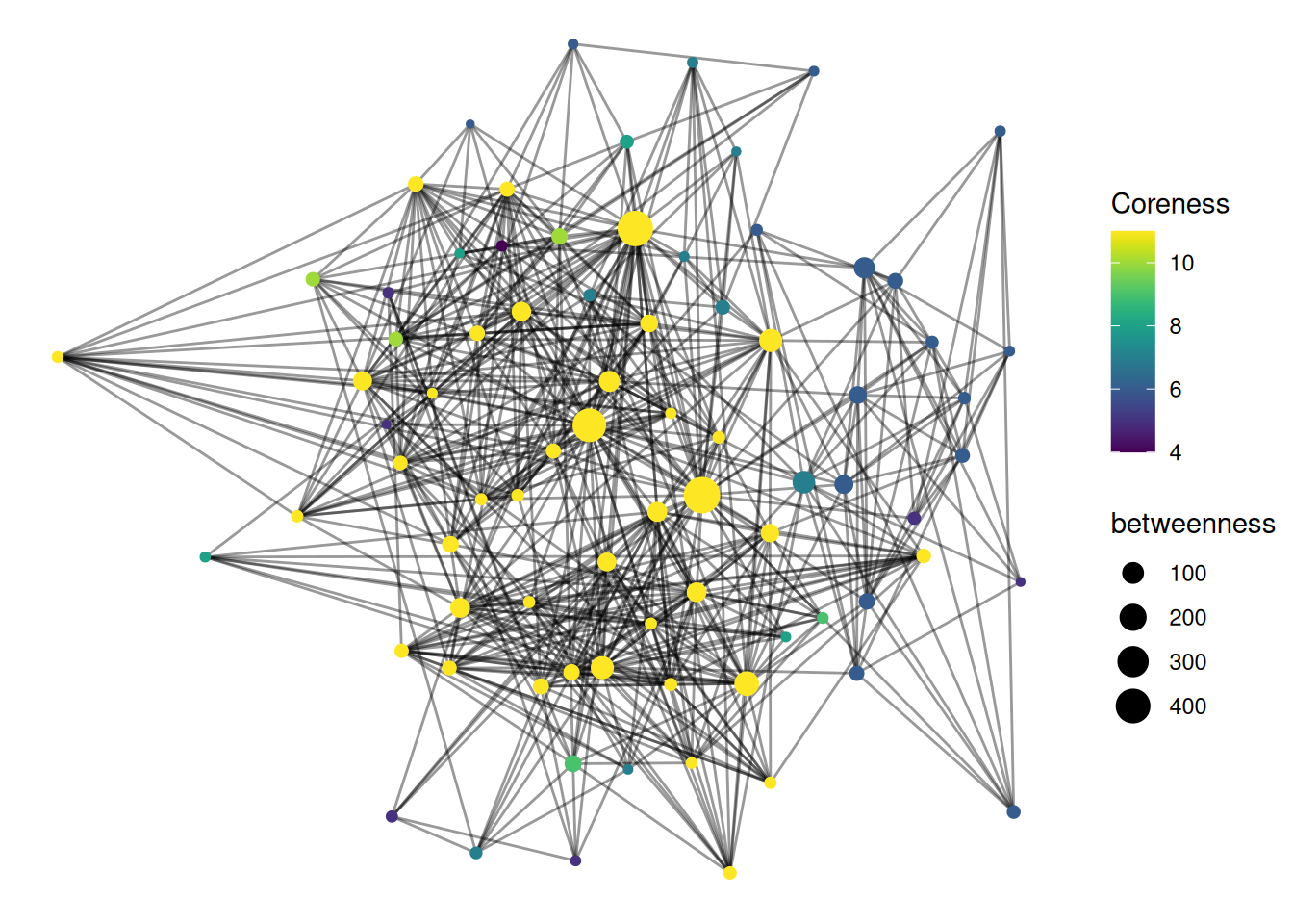 Let’s combine a few ideas from the last few labs. Imagine you have a group with a strong core-periphery structure, and you want to figure out who is most influential, but only among those in the core. Take the UK network and filter it to only nodes with a coreness of 4 or more. After filtering, calculate the betweenness centrality of these nodes. Finally, visualize the network with node size as betweenness centrality and color as coreness.