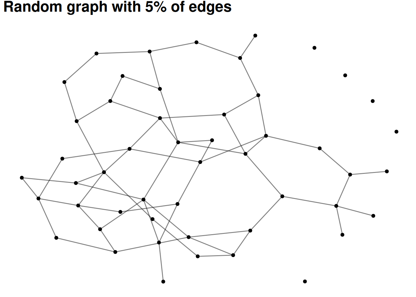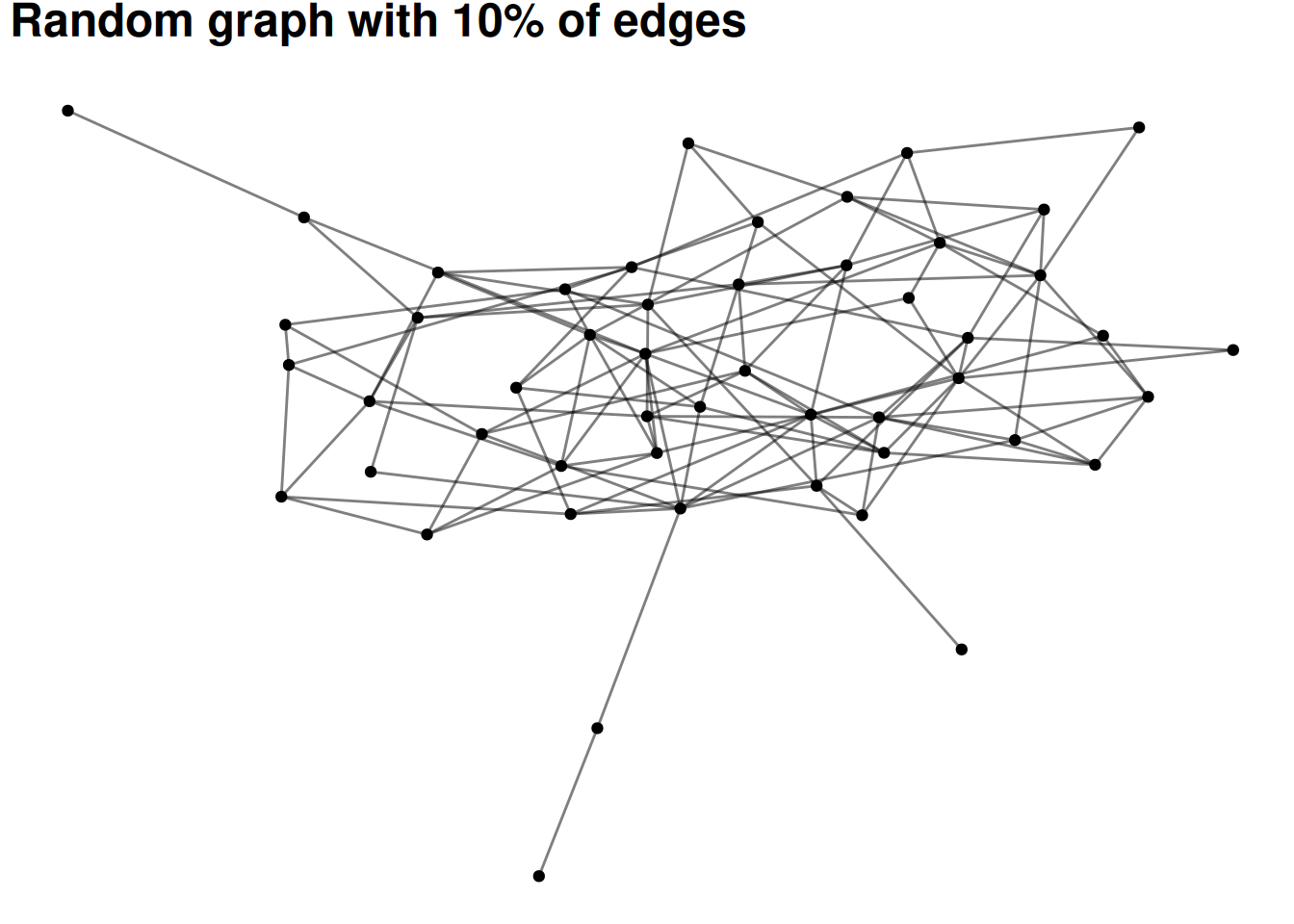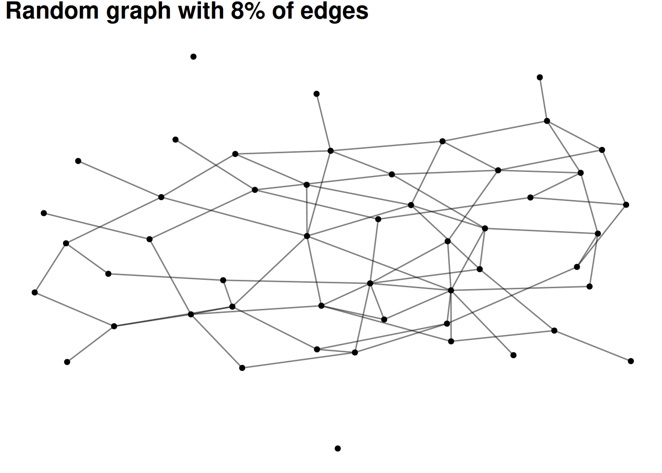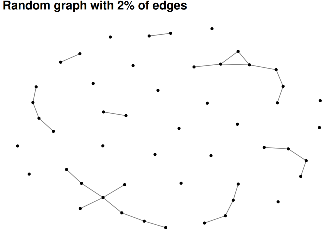 The following visualizations show random graphs as they go from 2% density to 10% density. Even at only 8% or 10% density almost any random graph will be a single, large component (with maybe a few isolates).