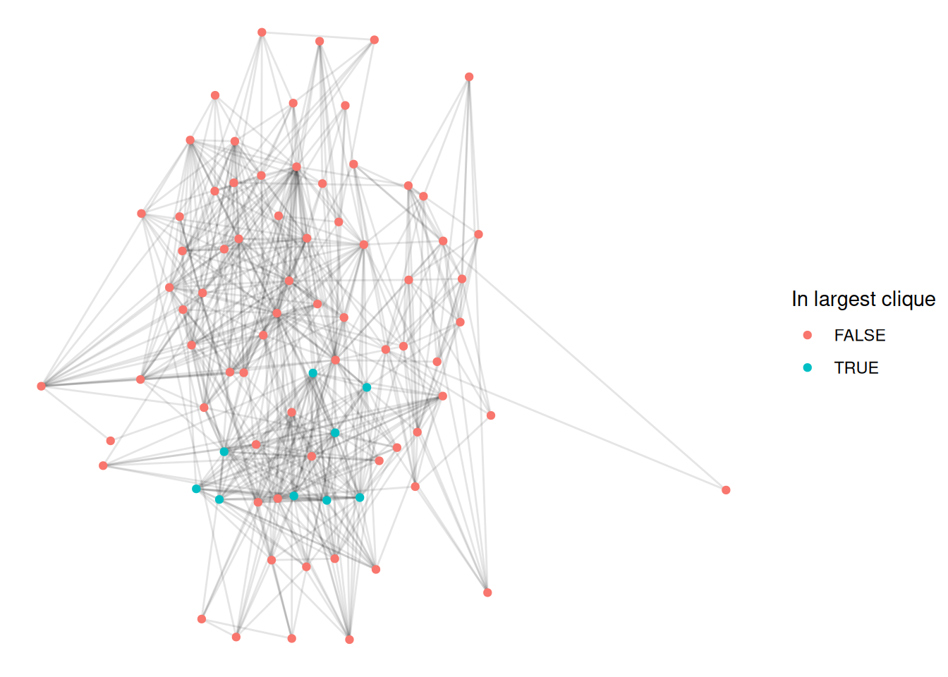 # First, get the list of nodes in the first cliqueclique_nodes <-largest_cliques(UK)[[1]]UK |>activate(nodes) |>mutate(idx =1:nrow(.N())) |># Create an index for the nodesmutate(in_clique = idx %in% clique_nodes) |># If the index is one of the clique nodesggraph(layout ='stress') +geom_edge_fan(alpha=.1) +geom_node_point(aes(color=in_clique)) +# Color by whether the node is in the cliquescale_color_discrete(name='In largest clique')