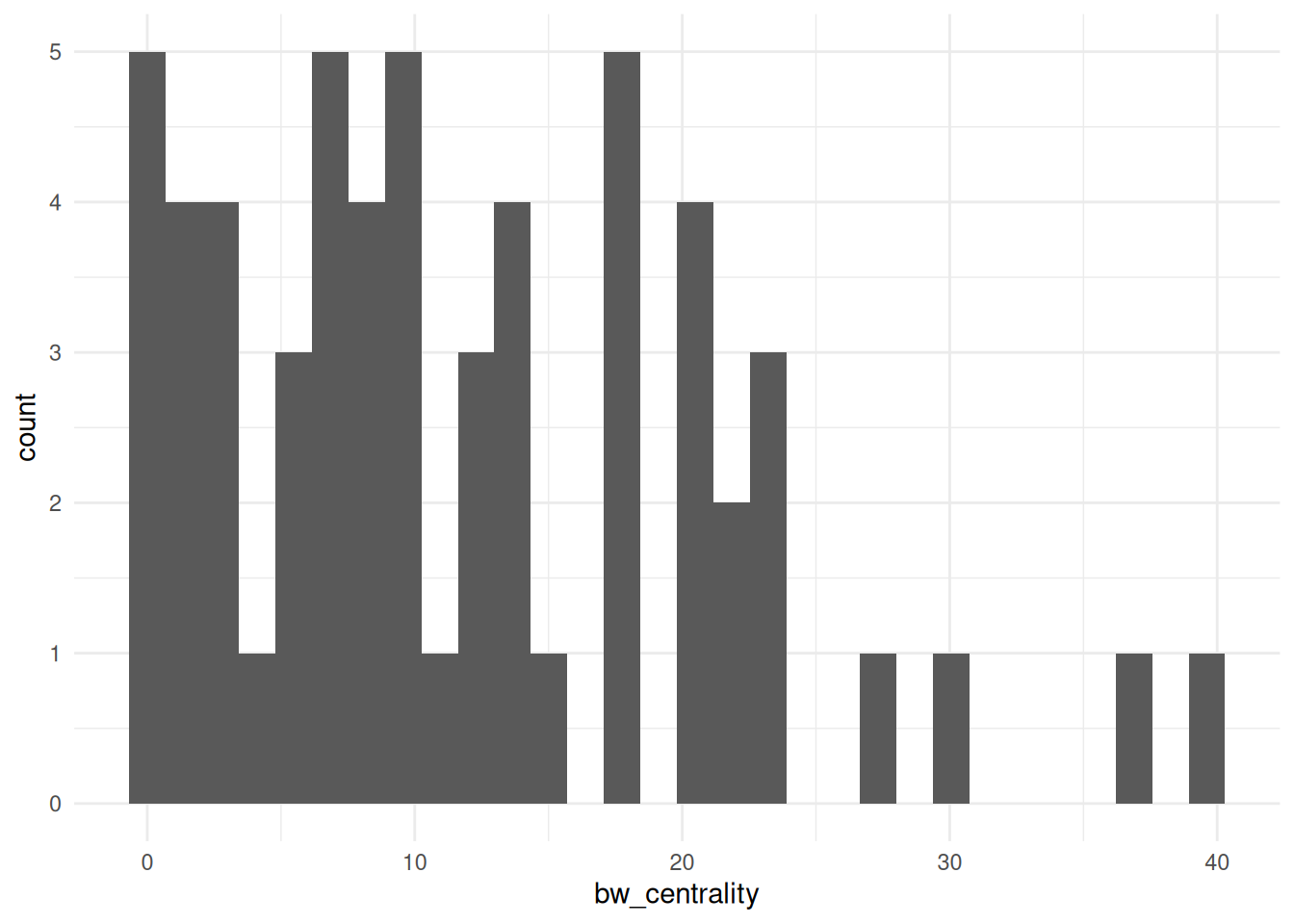 If we want to visualize how centralized a network is, a good way to do that is to show the distribution of degree (or betweenness or another centrality measure.) As we have done in a few previous labs, we’ll first need to create the column using mutate and then we’ll visualize it in the same way, using ggplot and geom_histogram.