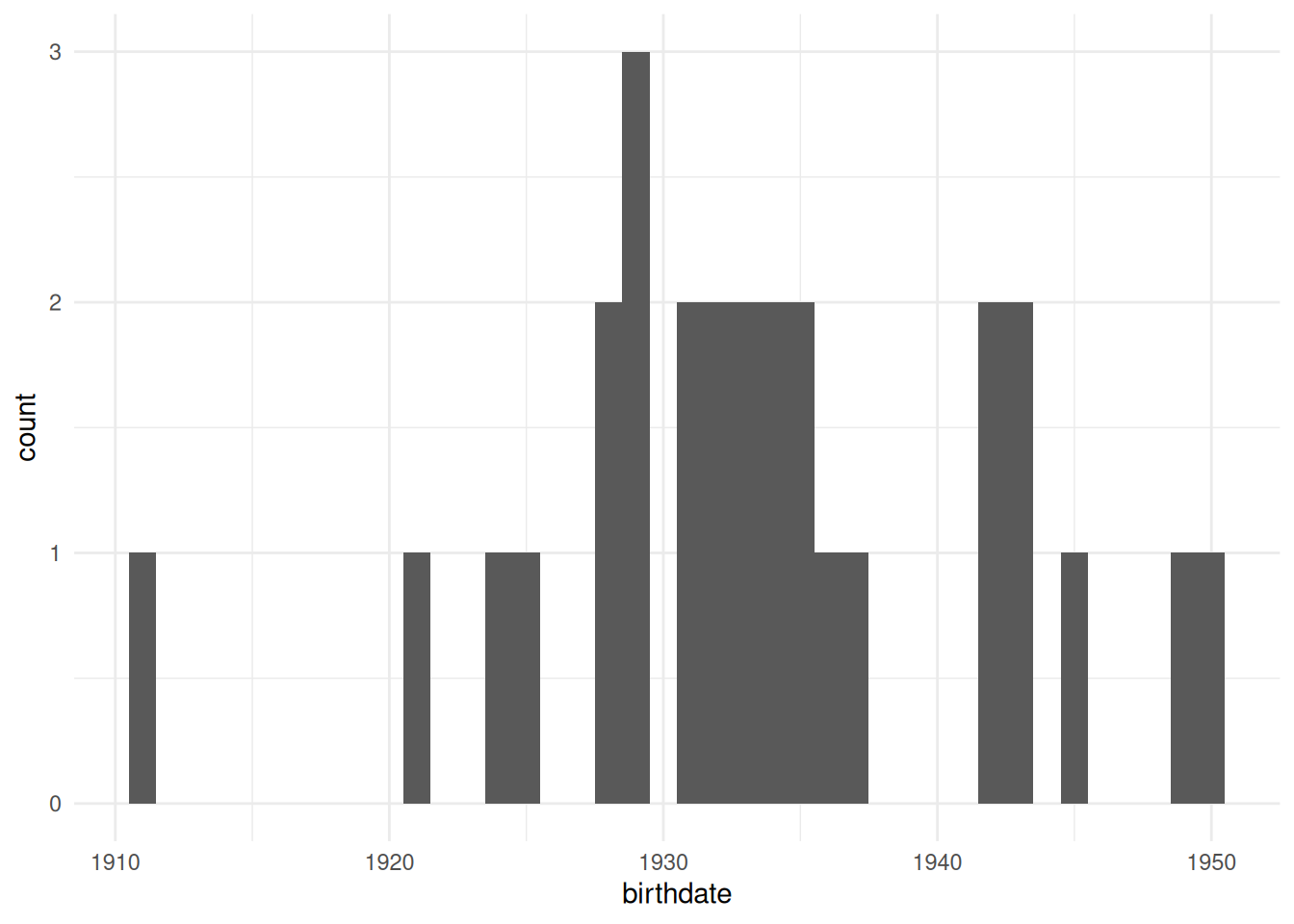 geom_histogram(aes(x=birthdate), binwidth=1) +