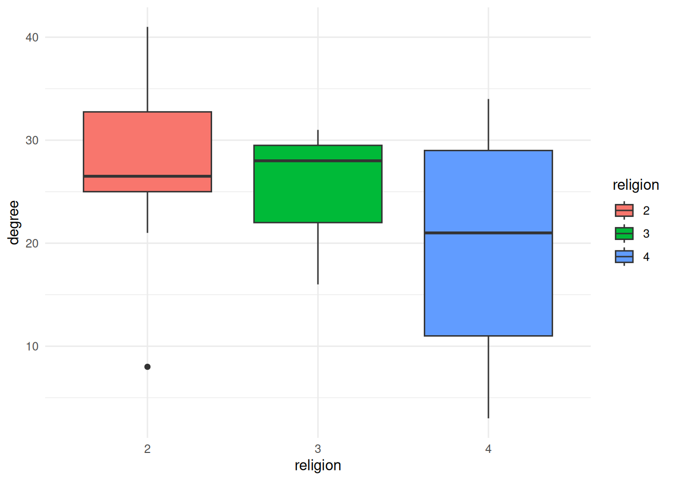 geom_boxplot(aes(x=religion, fill=religion, y=degree)) + # `fill` changes the filled in color. Try changing this to `color` instead