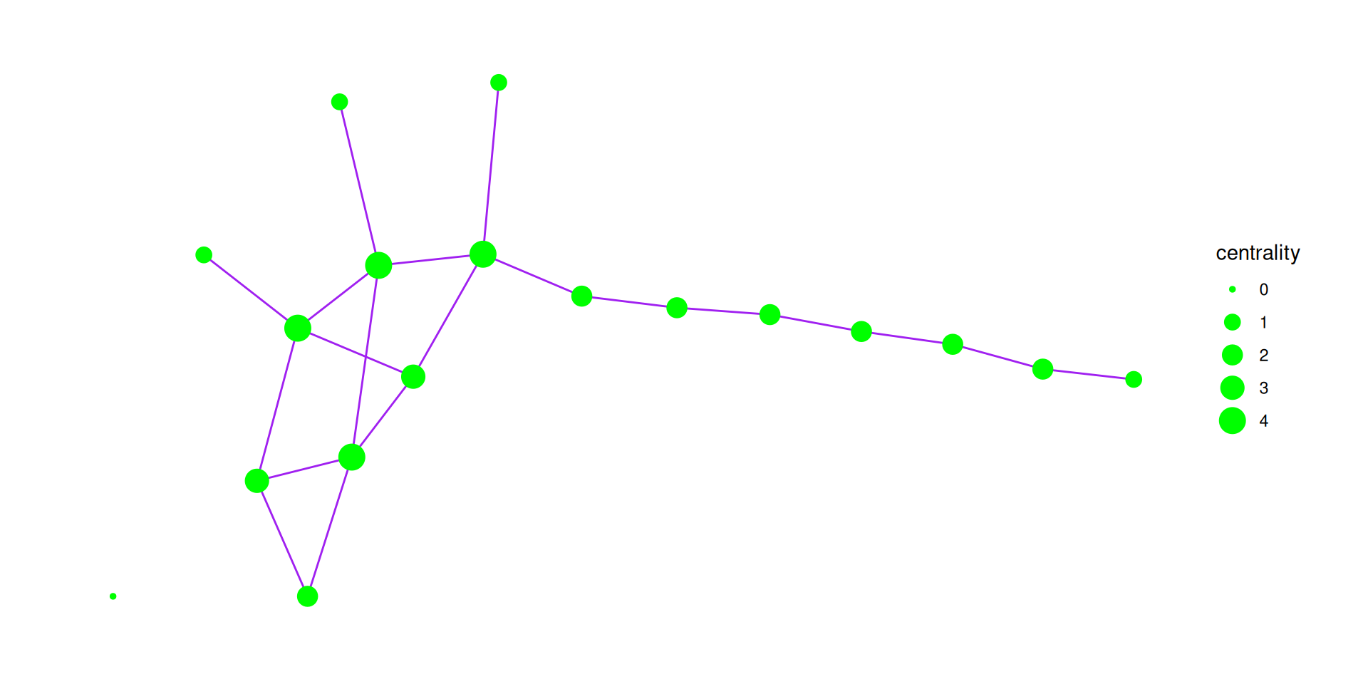 G |>mutate(centrality =centrality_degree()) |>activate(edges) |>ggraph() +geom_edge_fan(color ='purple') +geom_node_point(aes(size = centrality), color ='green')
